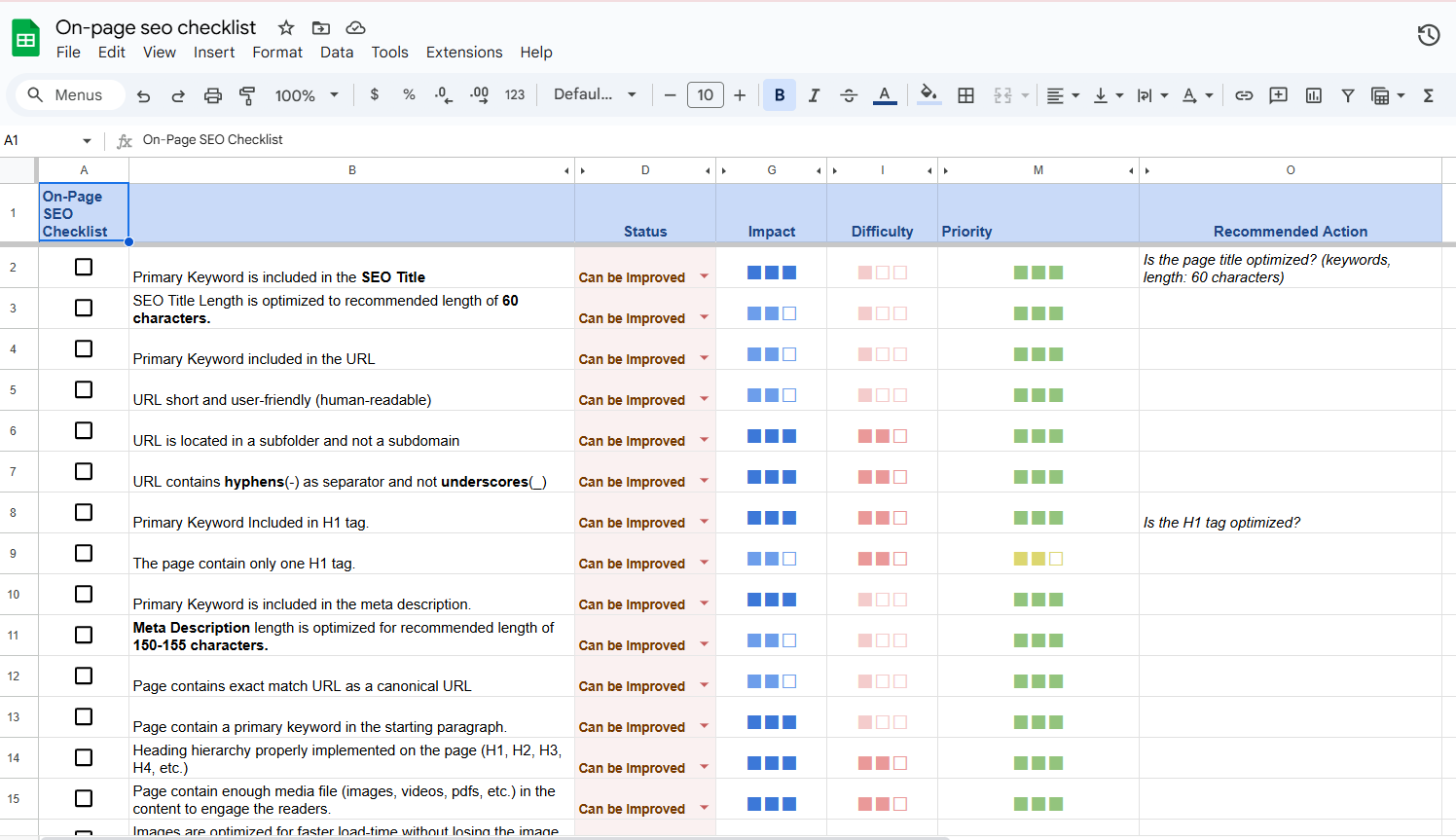 Use variations and long-tail keywords too, like “on-page SEO checklist” or “SEO ranking factors.”
